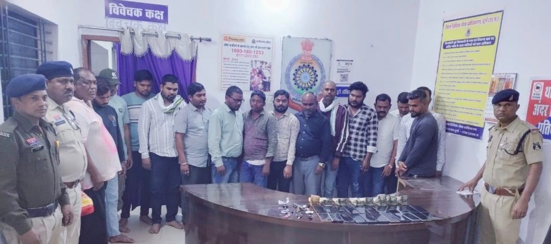 दुर्ग.  थाना अमलेश्वर क्षेत्र स्थित कृष्णा वाटिका रिसॉर्ट में चल रहे जुए के बड़े खेल पर पुलिस ने सख्त कार्रवाई करते हुए 16 आरोपियों को रंगे हाथों गिरफ्तार किया है। इस जुआ में पार्षद पति, कांग्रेस और बीजेपी के पदाधिकारी शामिल है। चौकाने वाली बात यह है कि अपने – अपने पदाधिकारियों को छुड़ाने रसुखदारों के फोन घनधनाएं, लेकिन दुर्ग पुलिस ने किसी की नहीं सूनी और जुआ एक्ट में कार्रवाई की। (16 arrested for gambling at Krishna Vatika Resort, a councillor’s husband also arrested)