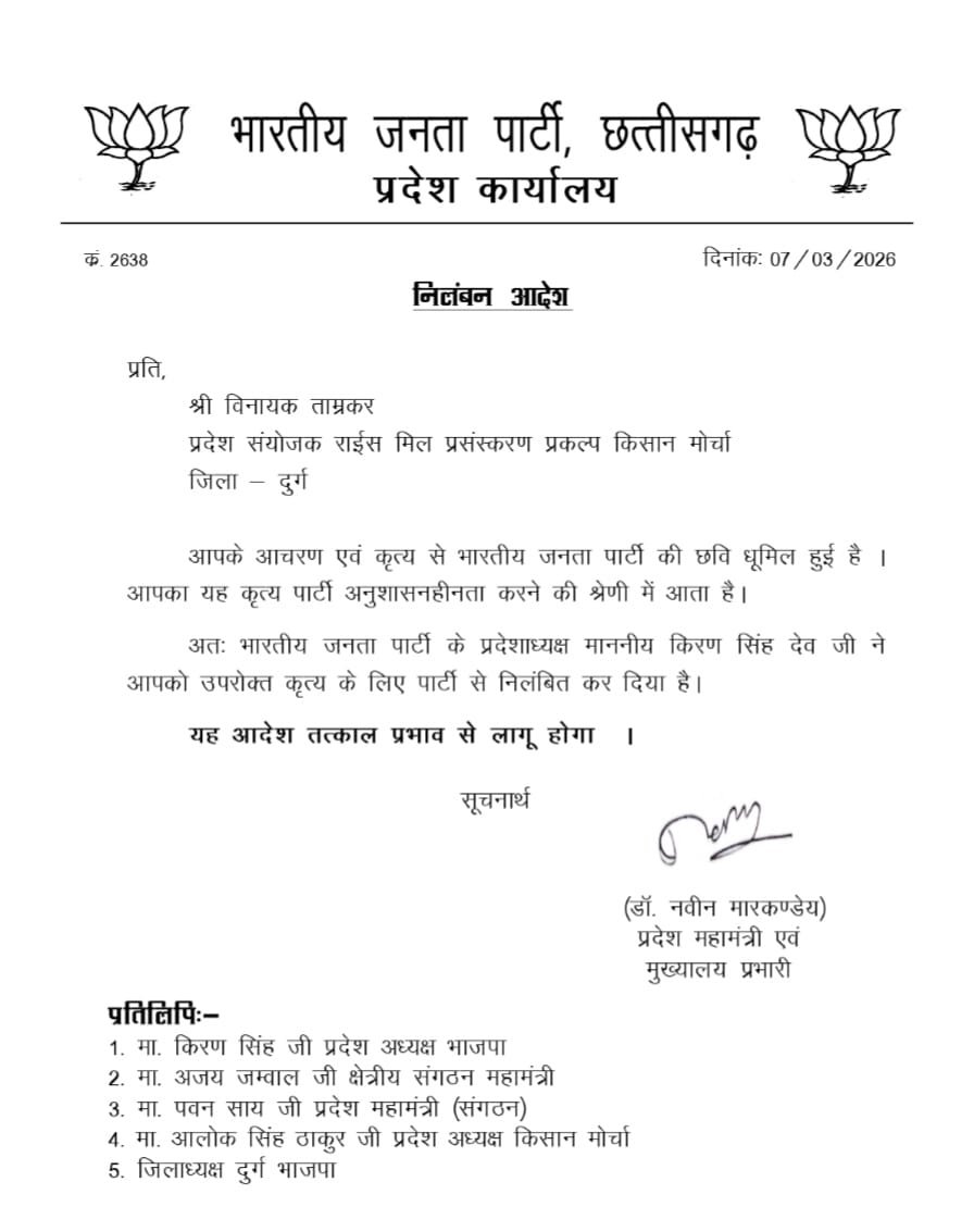 शनिवार को भारतीय जनता पार्टी प्रदेश कार्यालय रायपुर से जारी पत्र के अनुसार प्रदेश संयोजक राइस मिल प्रसंस्करण प्रकल्प किसान मोर्चा विनायक ताम्रकार के ऊपर पार्टी की छवि को धूमिल करने का आरोप लगा है। जिसके बाद मामले की गंभीरता को देखते हुए प्रदेश अध्यक्ष भाजपा किरण सिंह देव ने निलंबन आदेश जारी कर दिया है।