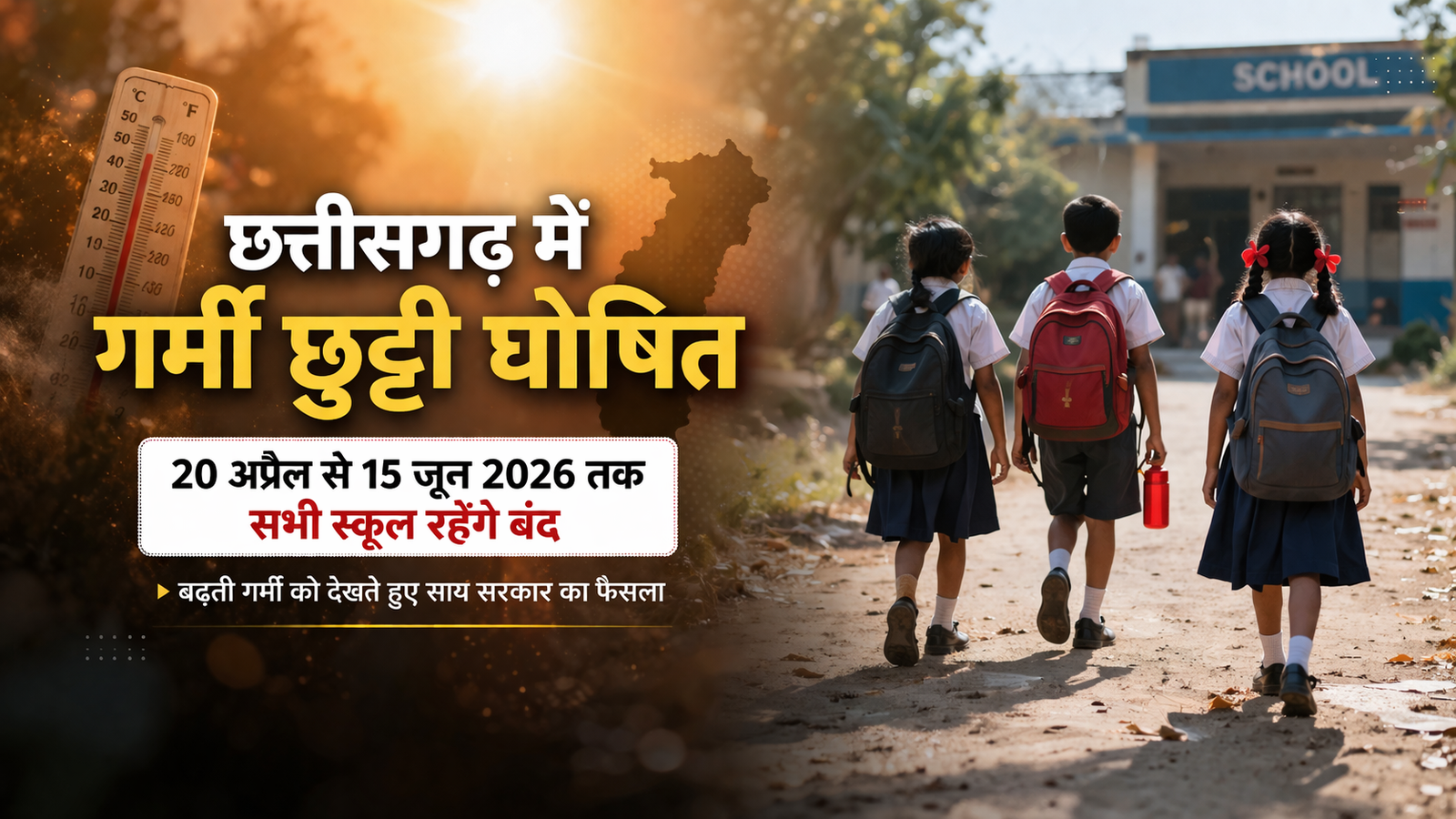 बढ़ते तापमान और बच्चों की तबीयत बिगड़ने की शिकायतों को देखते हुए राज्य सरकार ने बड़ा फैसला लिया है। साय सरकार ने छत्तीसगढ़ में गर्मी की छुट्टियों (CG Summer Vacation 2026) की घोषणा कर दी है। जारी आदेश के अनुसार, राज्य के सभी सरकारी और निजी स्कूल 20 अप्रैल 2026 से 15 जून 2026 तक पूरी तरह बंद रहेंगे।