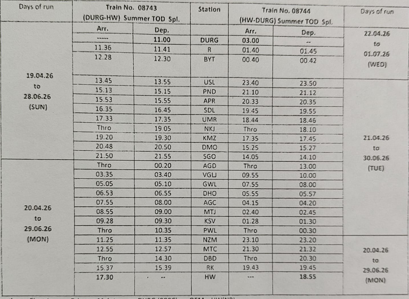 प्रत्येक रविवार, 19 अप्रैल से 28 जून तक - गाड़ी संख्या 08744 (हरिद्वार-दुर्ग):