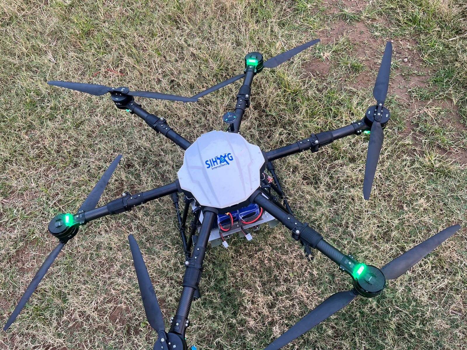 हैक्साकॉप्टर डिजाइन: 6 प्रोपेलर होने के कारण यह सिंगल या क्वाड ड्रोन की तुलना में ज्यादा स्थिर और विश्वसनीय है। पर्याप्त पेलोड ले जा सकता है।