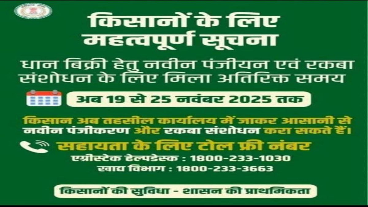 CG Prime News@दुर्ग. Additional opportunity for farmers to sell paddy in chhattisgarh राज्य शासन ने किसानों की सुविधा को प्राथमिकता देते हुए धान खरीदी के लिए नवीन पंजीयन तथा रकबा संशोधन की अंतिम तिथि बढ़ा दी है। अब किसान 25 नवंबर 2025 तक अपने तहसील कार्यालय में जाकर आसानी से नवीन पंजीकरण एवं रकबा संशोधन करवा सकेंगे। जो किसान किसी कारण से निर्धारित समयसीमा में पंजीयन नहीं करा पाए थे। अतिरिक्त समय मिलने से अधिक से अधिक किसान आगामी धान खरीदी प्रक्रिया में सम्मिलित हो सकेंगे।