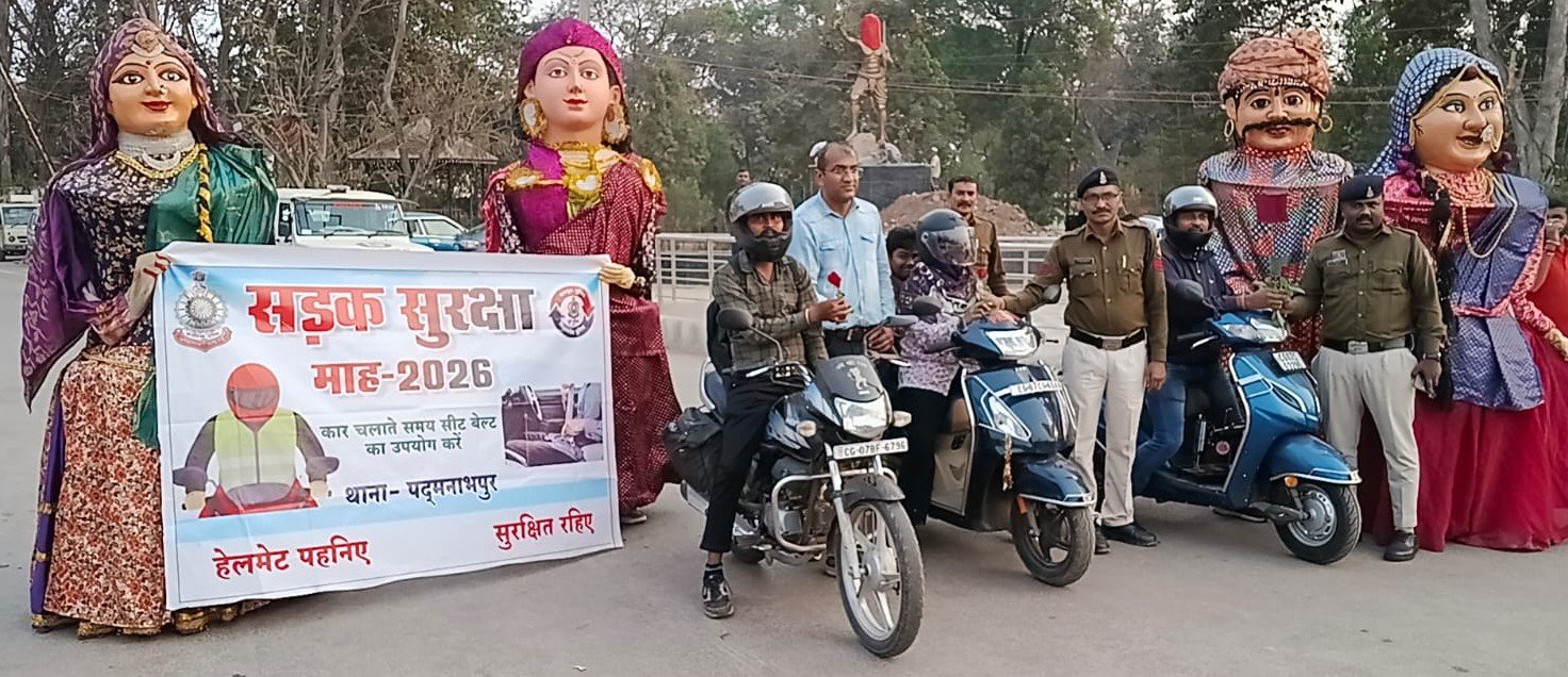 दुर्ग | राष्ट्रीय सड़क सुरक्षा माह–2026 के अंतर्गत दुर्ग पुलिस द्वारा आम नागरिकों को सड़क सुरक्षा एवं यातायात नियमों के प्रति जागरूक करने के लिए लगातार विभिन्न कार्यक्रम आयोजित किए जा रहे हैं। इसी कड़ी में एक अभिनव और प्रभावशाली पहल के तहत कठपुतली कला के माध्यम से लोगों को यातायात नियमों का संदेश दिया गया।