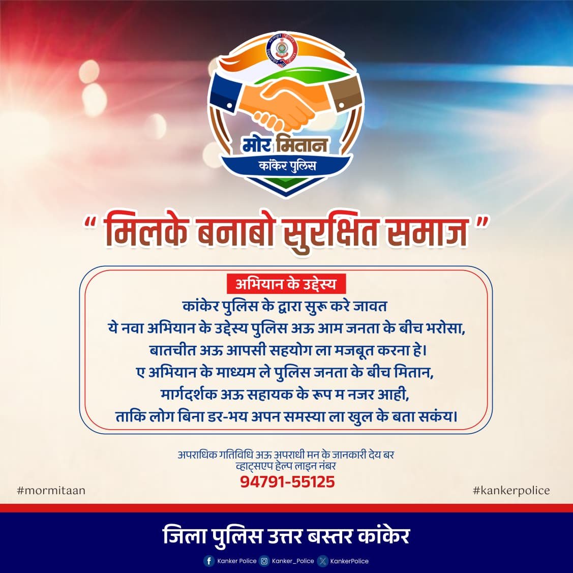 कांकेर। जिले में कानून-व्यवस्था को और अधिक सुदृढ़ बनाने तथा आम जनता के बीच विश्वास और संवाद को मजबूत करने के उद्देश्य से “मोर मितान–कांकेर पुलिस” अभियान की शुरुआत की गई है। पुलिस अधीक्षक श्री निखिल अशोक राखेचा (भा.पु.से.) के निर्देशन में जिले के विभिन्न थाना क्षेत्रों के अंतर्गत 154 ग्रामों में सुदृढ़ बीट प्रणाली लागू की गई है।