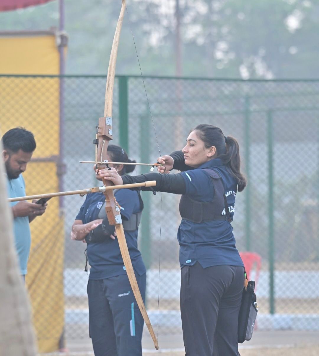 दुर्ग में आयोजित अखिल भारतीय पुलिस तीरंदाजी प्रतियोगिता के दूसरे दिन क्वालिफिकेशन राउंड में मुकाबला करते तीरंदाज।
