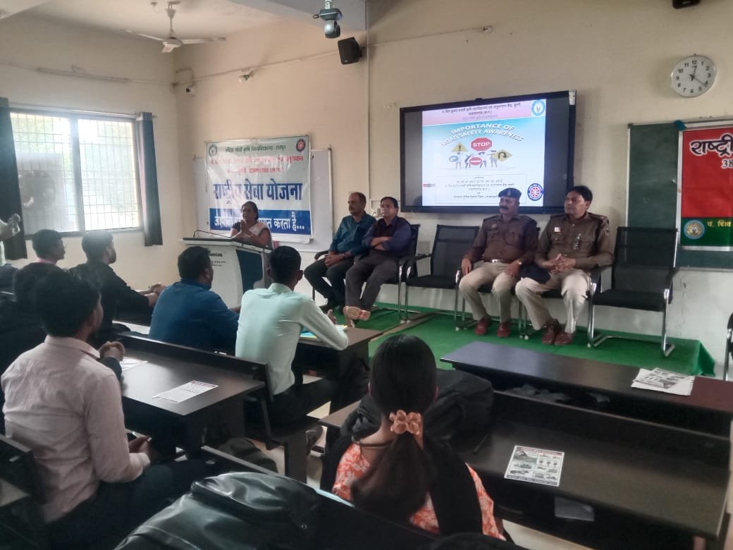 राजनांदगांव यातायात पुलिस द्वारा कृषि महाविद्यालय सुरगी में विद्यार्थियों को सड़क सुरक्षा नियमों की जानकारी देते हुए।