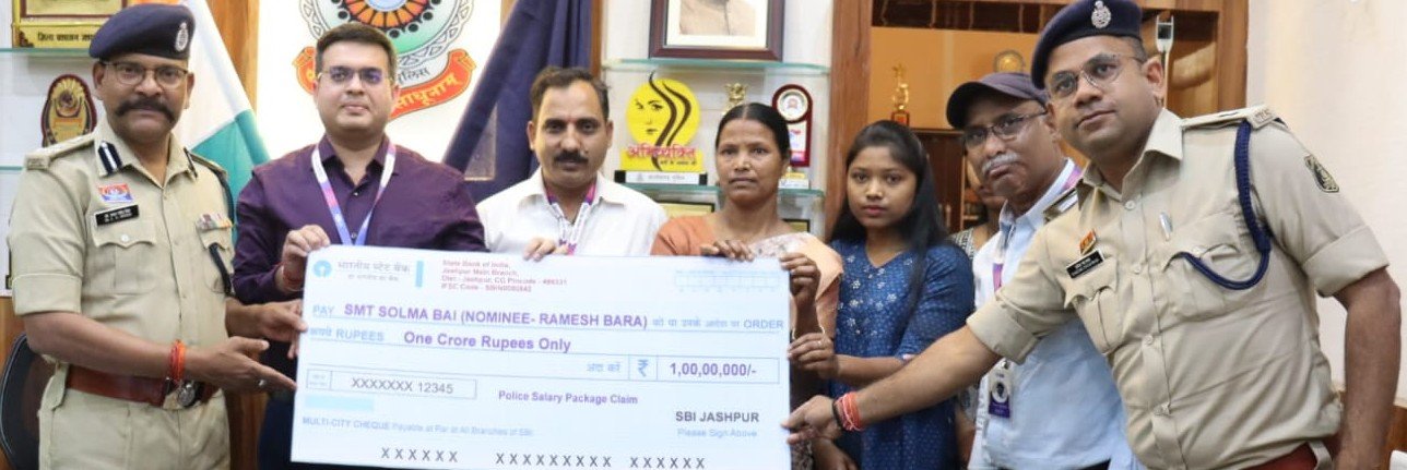 जशपुर. छत्तीसगढ़ शासन की महत्वाकांक्षी Police Salary Package योजना के तहत दिवंगत आरक्षक रमेश बड़ा के परिवार को बड़ी आर्थिक सहायता प्रदान की गई। योजना के अंतर्गत उनकी पत्नी सोलमा बाई को State Bank of India के माध्यम से 1 करोड़ रुपये की जीवन बीमा सहायता राशि प्रदान की गई।