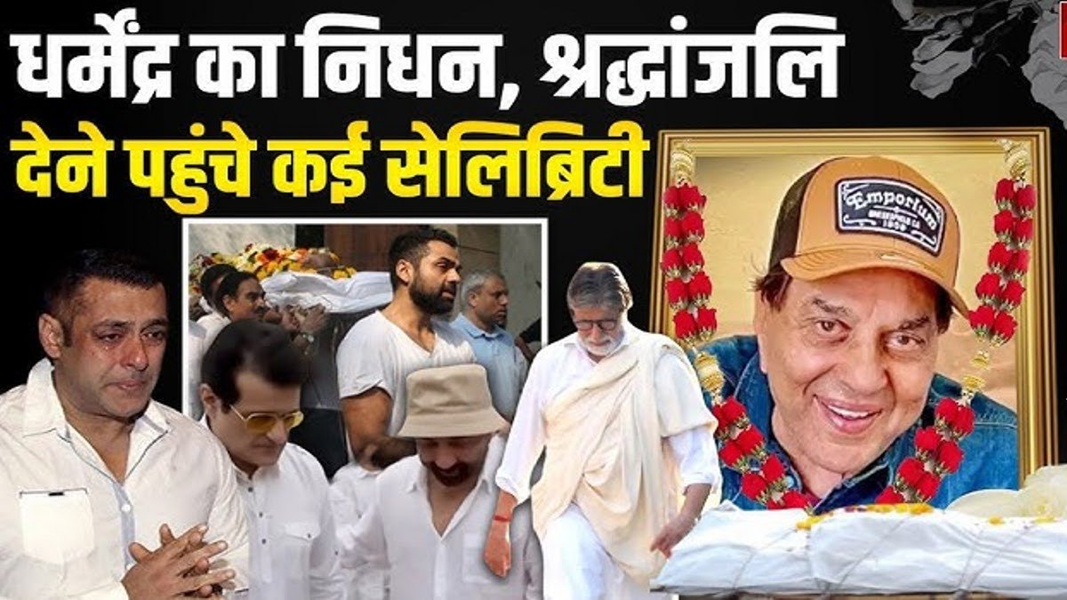 CG Prime News@दिल्ली. Bollywood actor Dharmendra passes away, breathed his last at the age of 89 बॉलीवुड के दिग्गज अभिनेता धर्मेंद्र का 89 साल की उम्र में निधन हो गया है। उनका अंतिम संस्कार सोमवार दोपहर मुंबई के विले पार्ले श्मशान भूमि में हुआ। अंतिम संस्कार में बिग बी अमिताभ बच्चन, धर्मेंद्र की पत्नी हेमा मालिनी, बेटी ईशा देवोल, सलमान खान, संजय दत्त, अमिताभ बच्चन, आमिर खान समेत कई सेलेब्स पहुंचे। देश के प्रधानमंत्री नरेंद्र मोदी ने दिग्गज अभिनेता धर्मेंद्र के निधन पर शोक जताया। एक युग के अंत का संकेत कहा है।